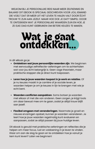 Elke transformatie – zowel persoonlijk als binnen een team – begint bij het individu. Door je eigen waarden te kennen, ontwikkel je een dieper begrip van wie je bent, wat je nodig hebt en hoe je kunt bijdragen aan het geheel. Download nu mijn gratis Ebook en krijg direct toegang tot inzichten en praktische tools die je helpen om keuzes te maken die écht bij jou passen. Je ontvangt:
